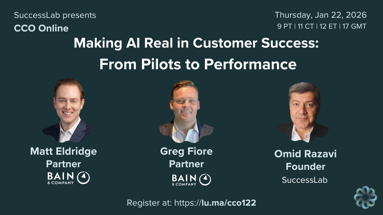 Join Matt Eldridge and Greg Fiore, Partners at Bain & Company, in conversation with Omid Razavi, Founder of SuccessLab, for an interactive live session on how Customer Success leaders are building an AI-first function that increases coverage, improves customer experience, and improves net revenue retention.