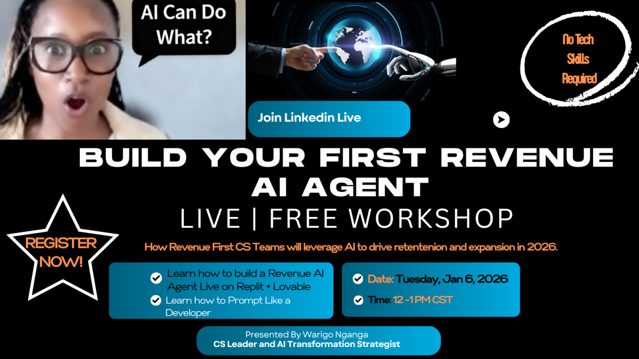 This 𝗟𝗶𝘃𝗲, 𝗵𝗮𝗻𝗱𝘀-𝗼𝗻 𝘀𝗲𝘀𝘀𝗶𝗼𝗻 will show 𝗖𝘂𝘀𝘁𝗼𝗺𝗲𝗿 𝗦𝘂𝗰𝗰𝗲𝘀𝘀 𝗹𝗲𝗮𝗱𝗲𝗿𝘀 and 𝗽𝗿𝗮𝗰𝘁𝗶𝘁𝗶𝗼𝗻𝗲𝗿𝘀 how to build a revenue-focused AI agent that turns everyday customer signals into clear retention and expansion actions. You’ll see real examples, a live agent build, and practical ways to apply this inside your current CS workflows. No prior 𝗔𝗜 𝗼𝗿 𝘁𝗲𝗰𝗵𝗻𝗶𝗰𝗮𝗹 𝗲𝘅𝗽𝗲𝗿𝗶𝗲𝗻𝗰𝗲 required! [...]